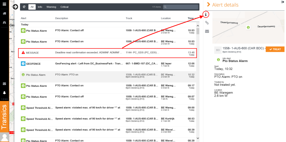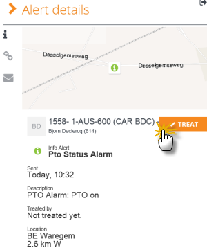 Click the Related Alarms icon to view all alarms of the selected vehicle for the current day. Click an alarm in the list to treat it.